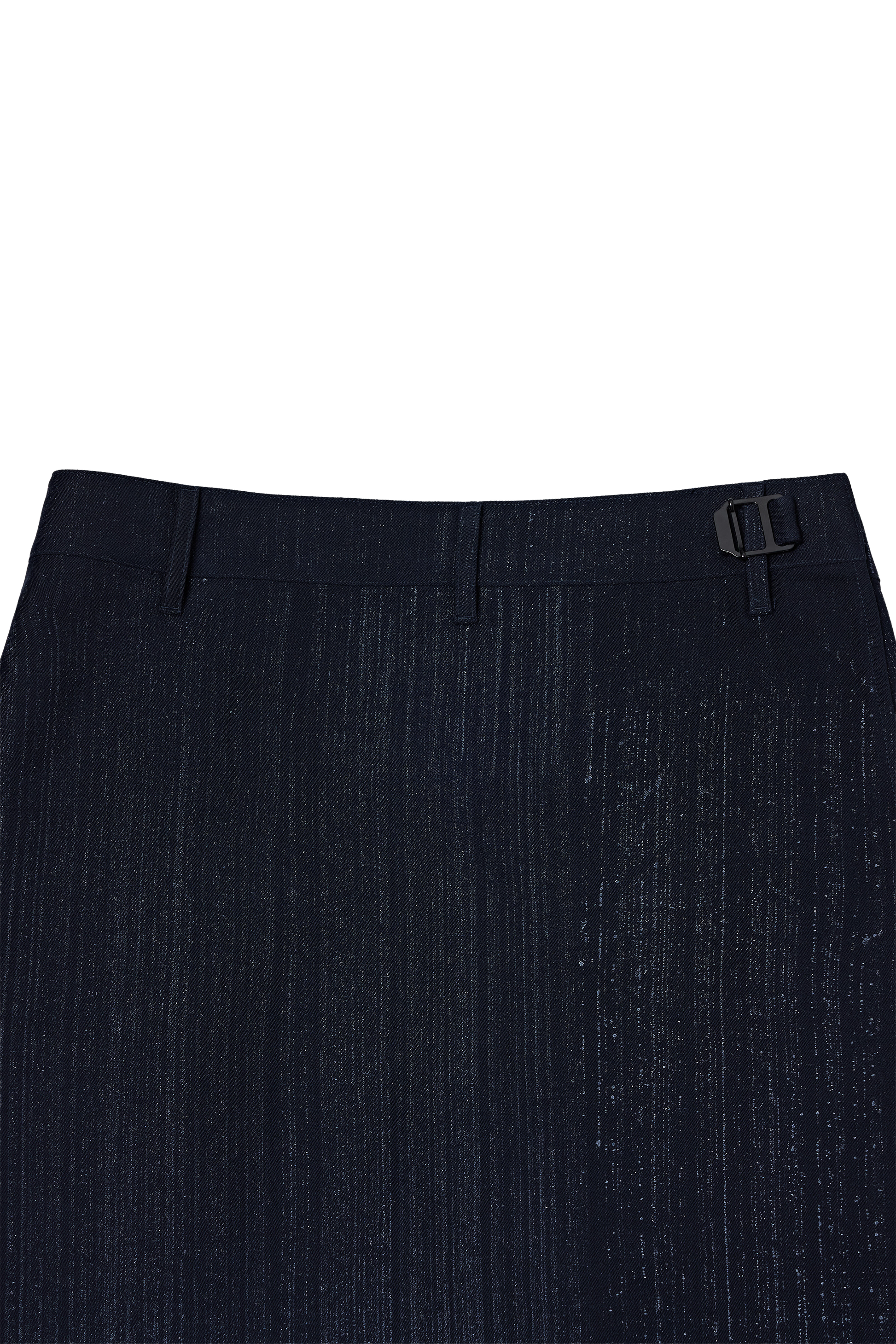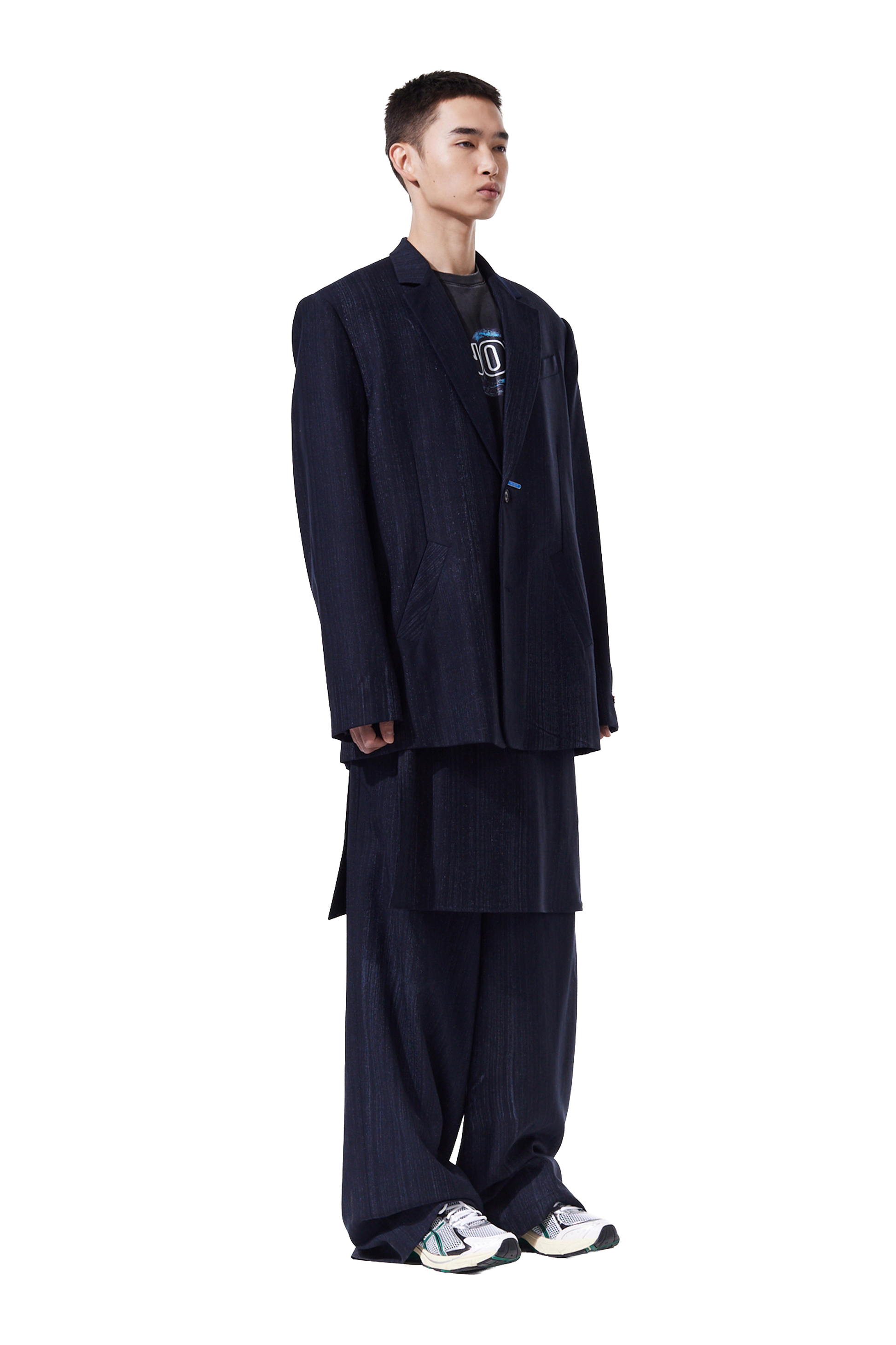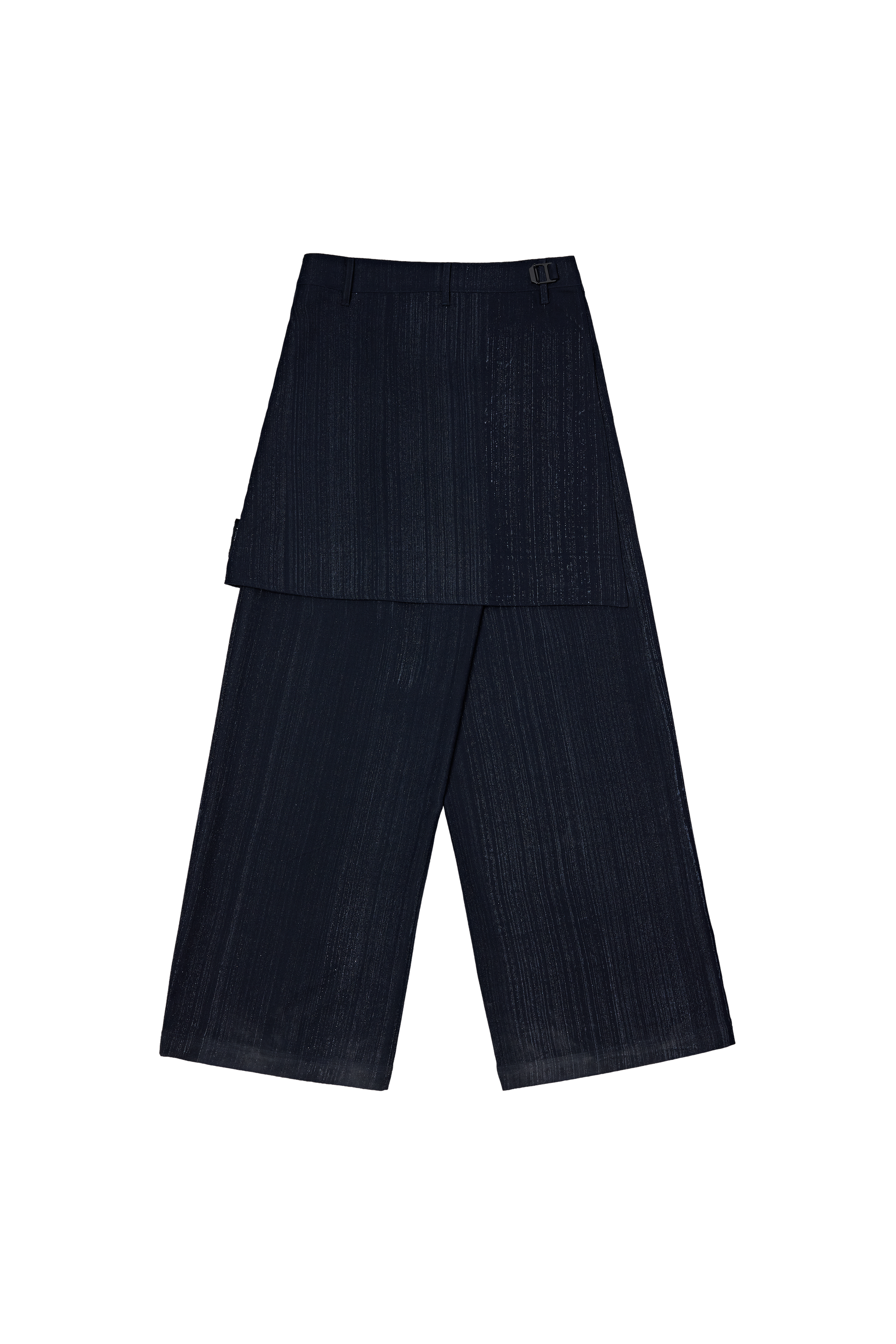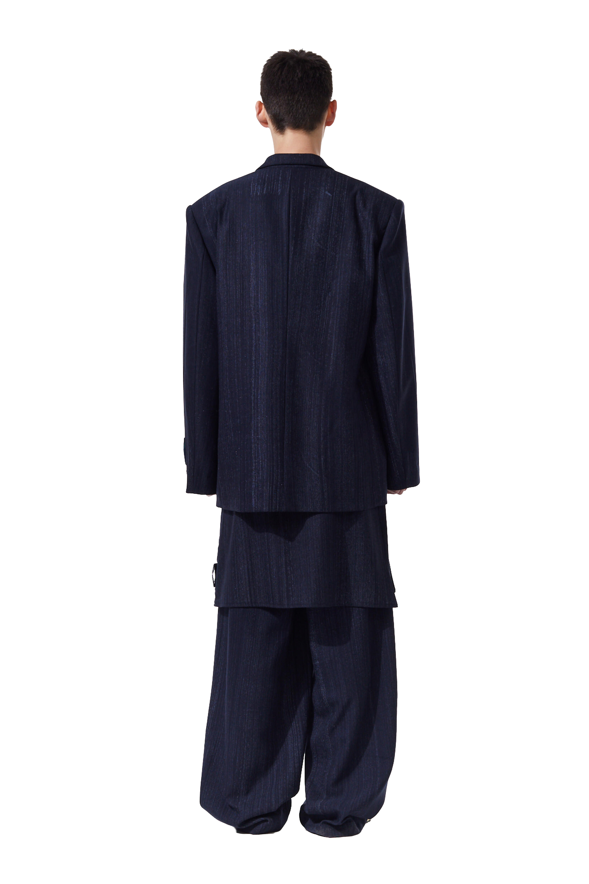 The wide-leg tailored trousers, adorned with hand-brushed pinstripe details and a classic color scheme.