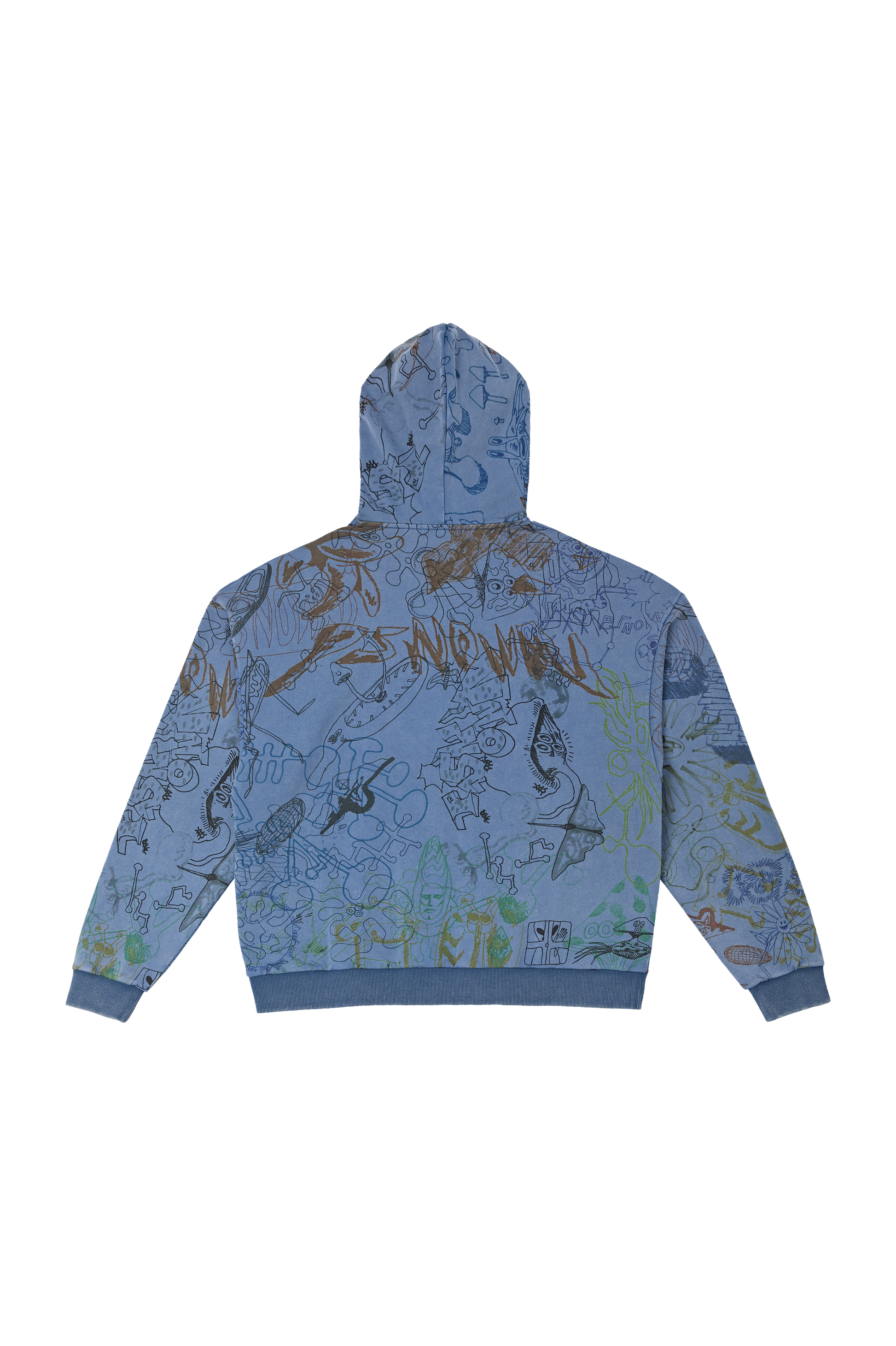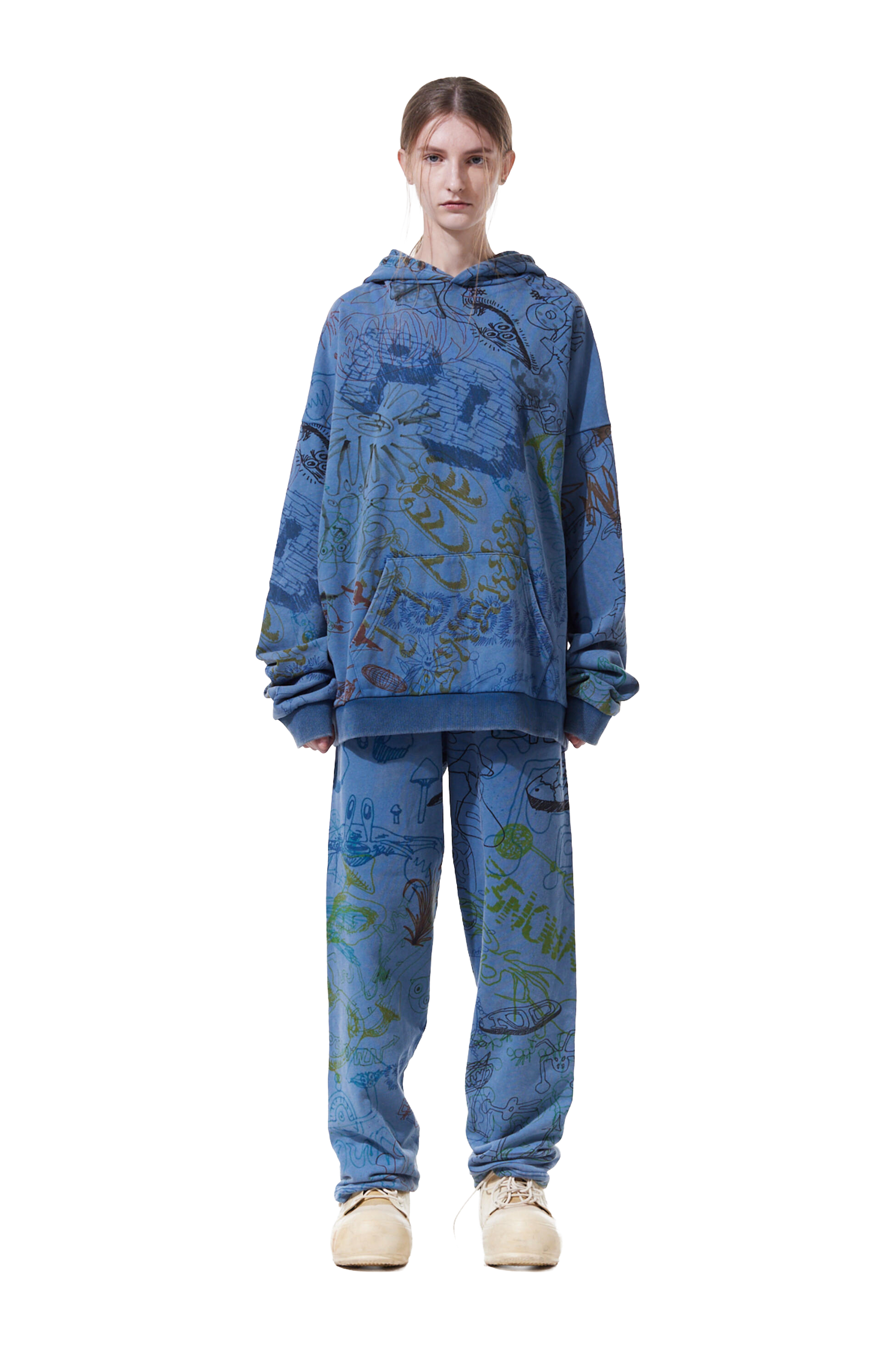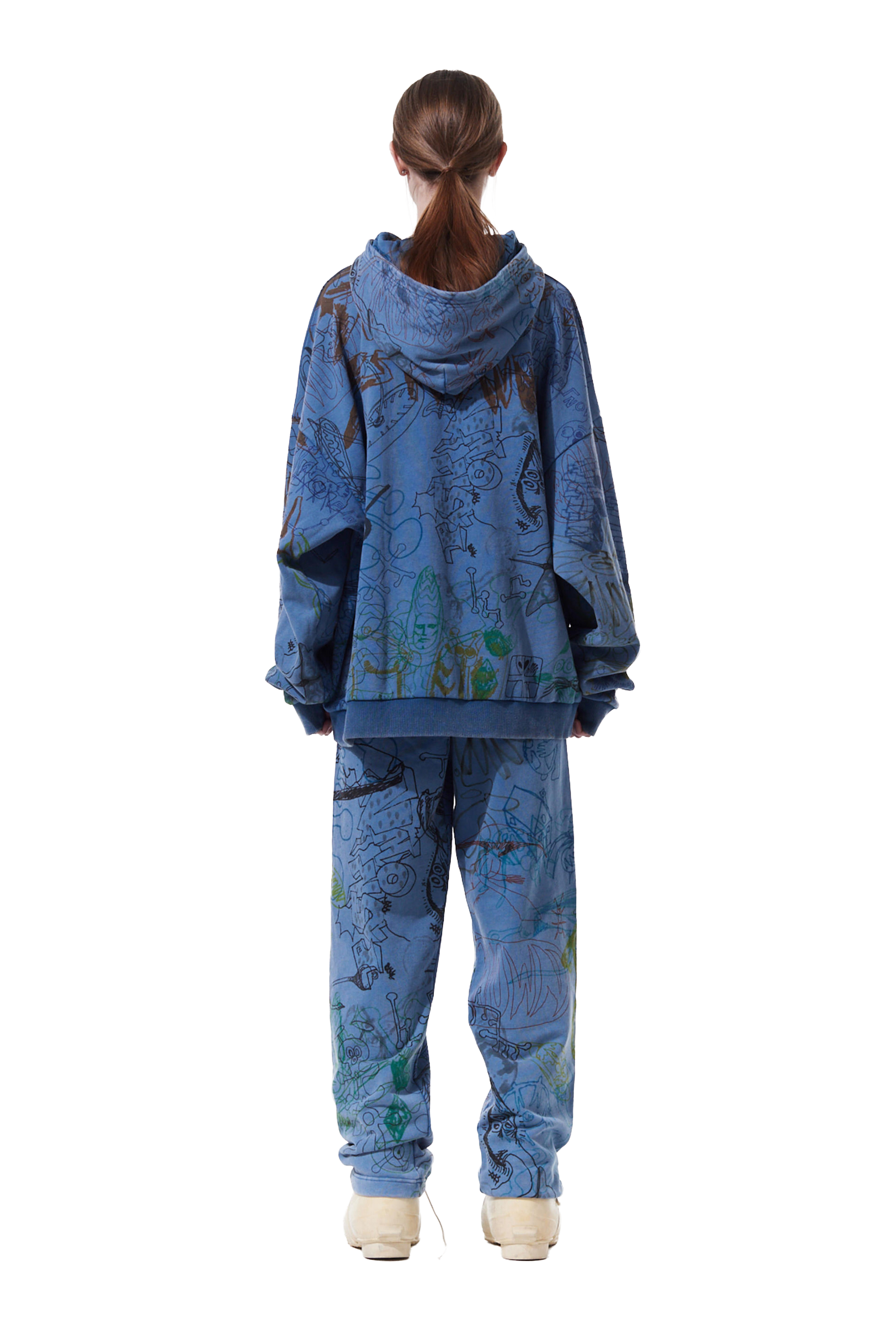 This oversized fit hoodie, adorned with all-over digital printed doodles.