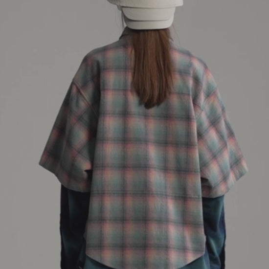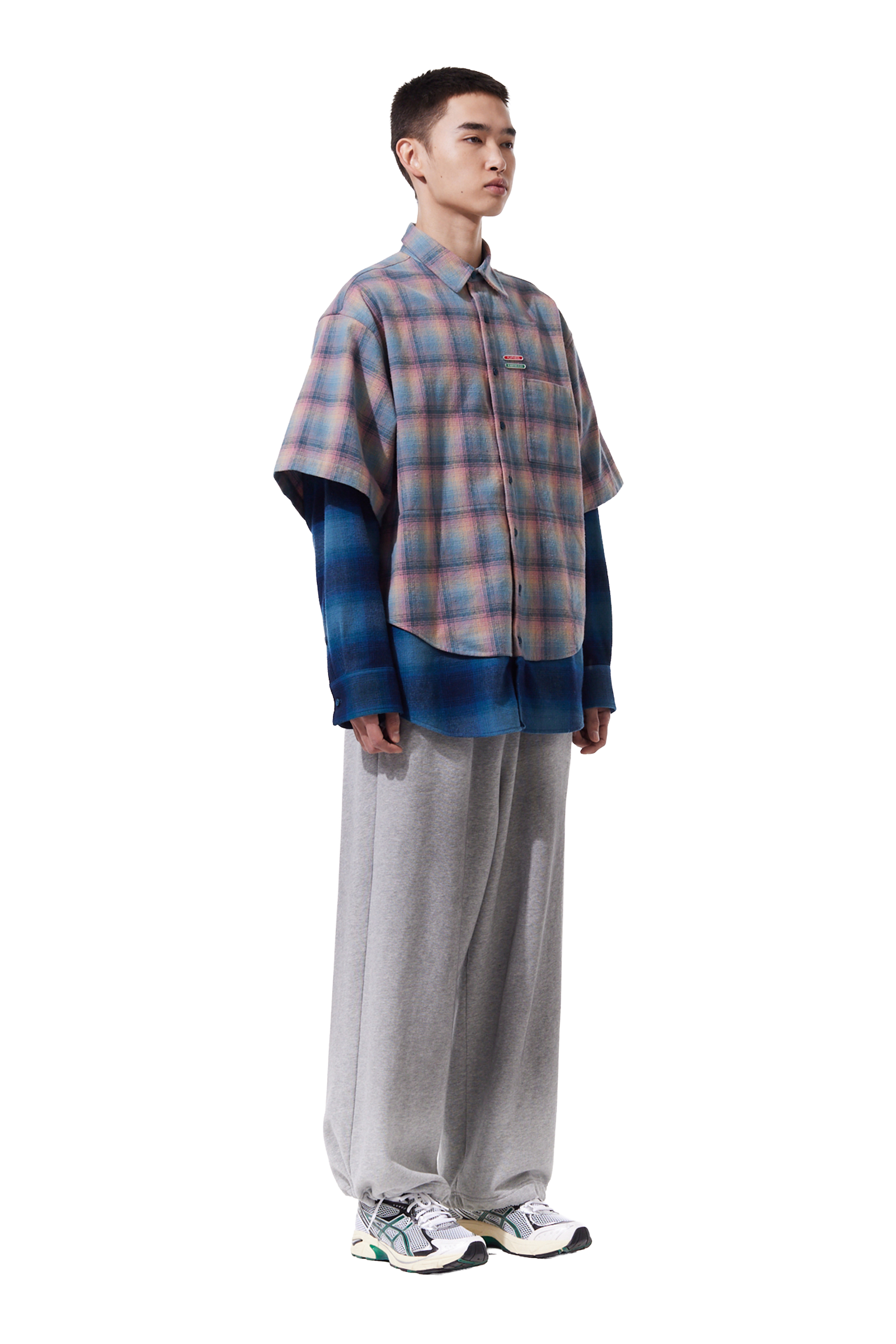 The double-layer sleeve flannel shirt, featuring contrasting colors and pin details on the front chest.