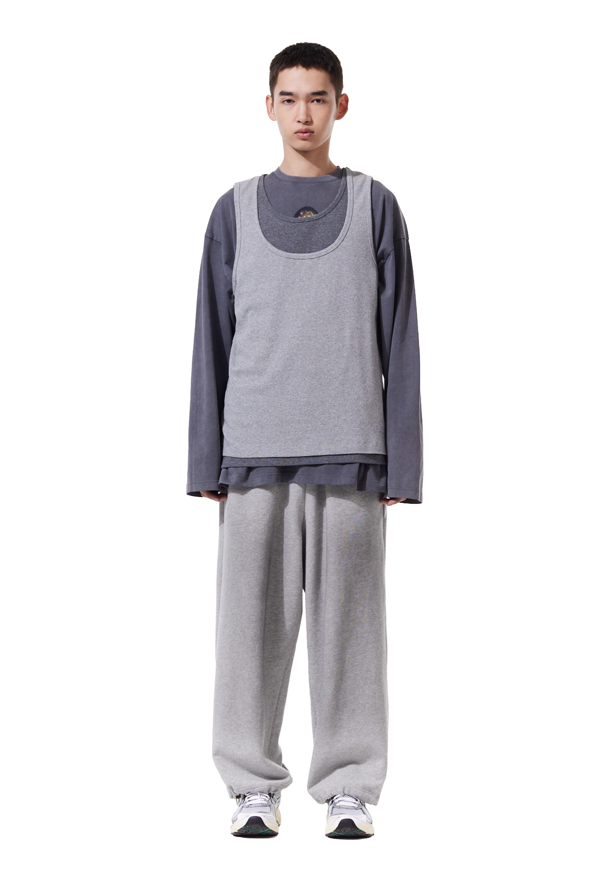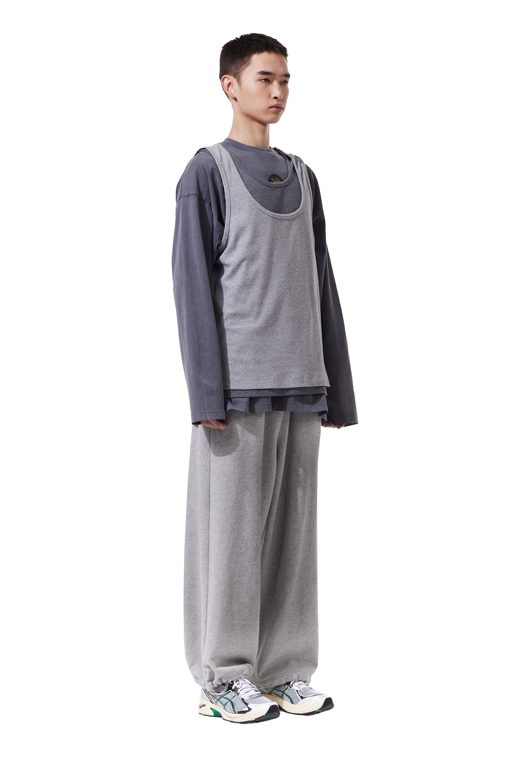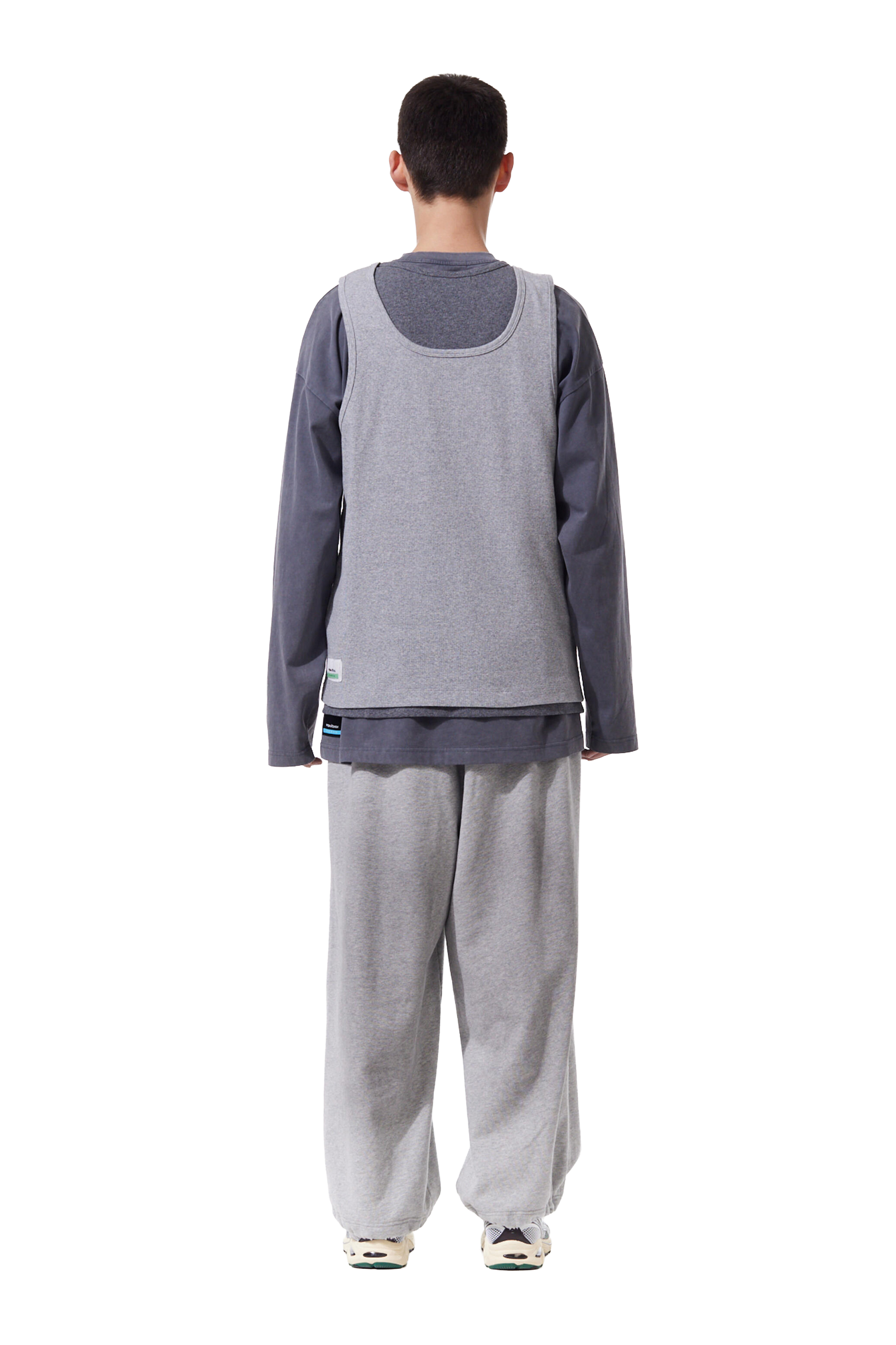 This simple two-toned double vest, featuring a length variation.