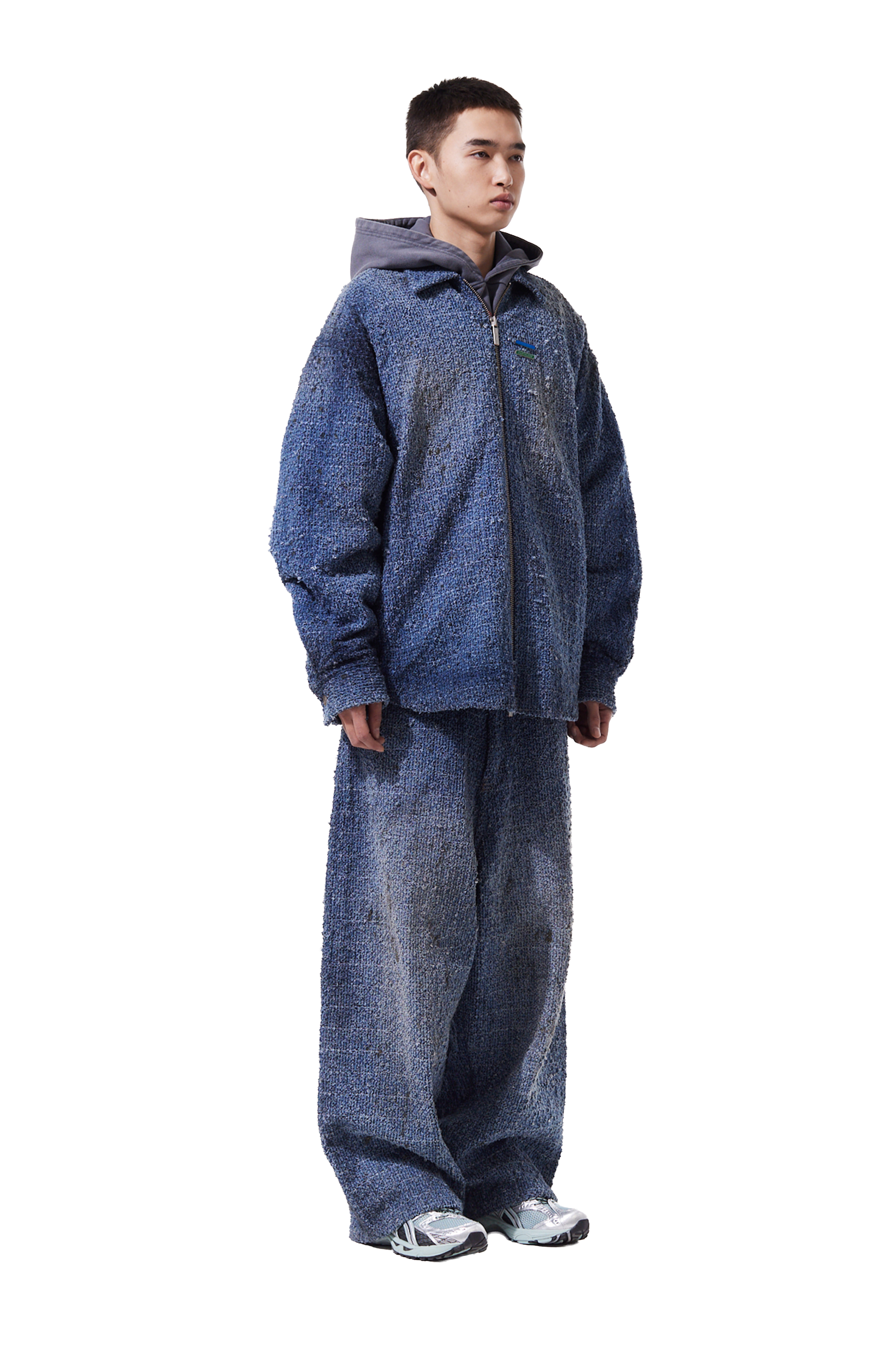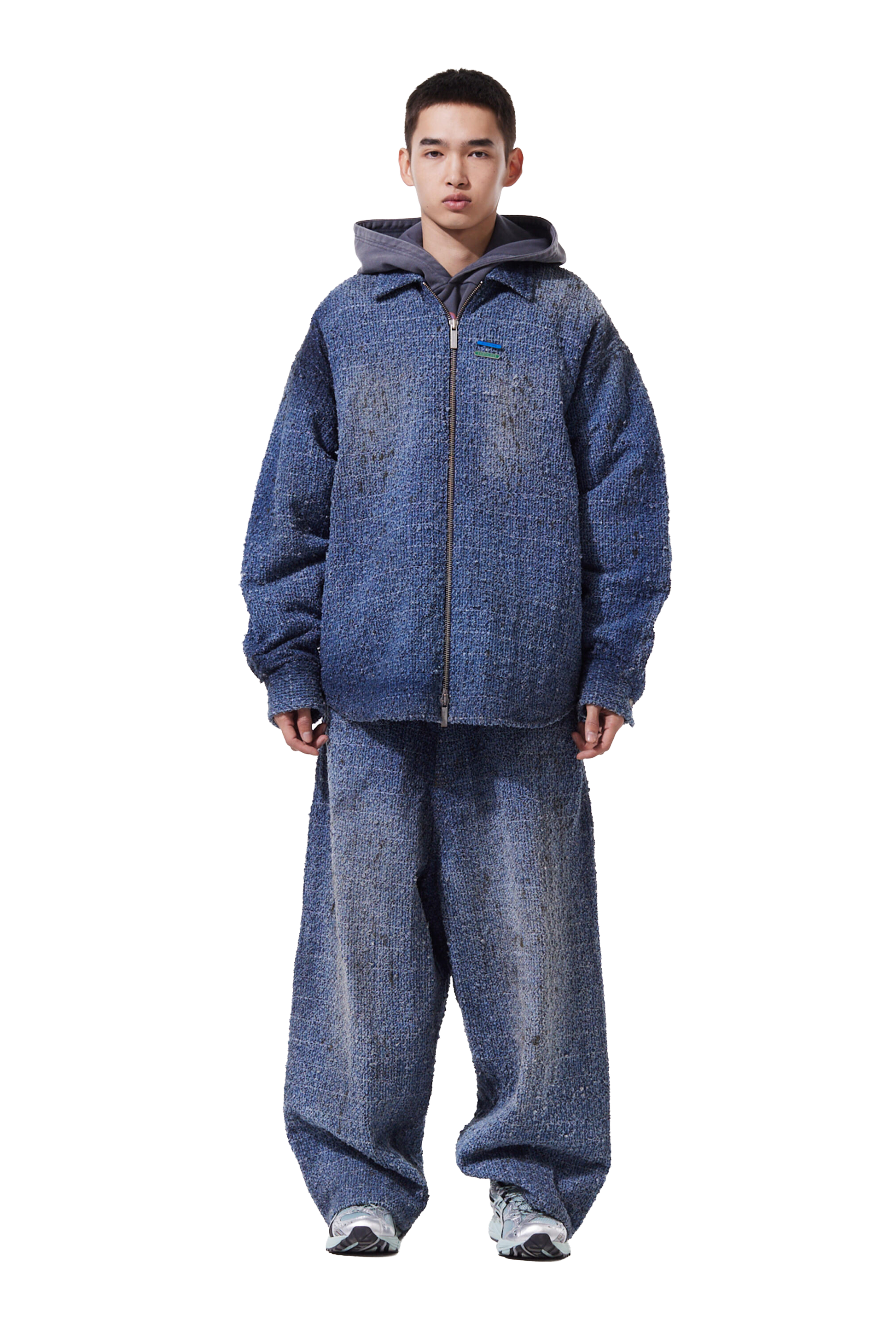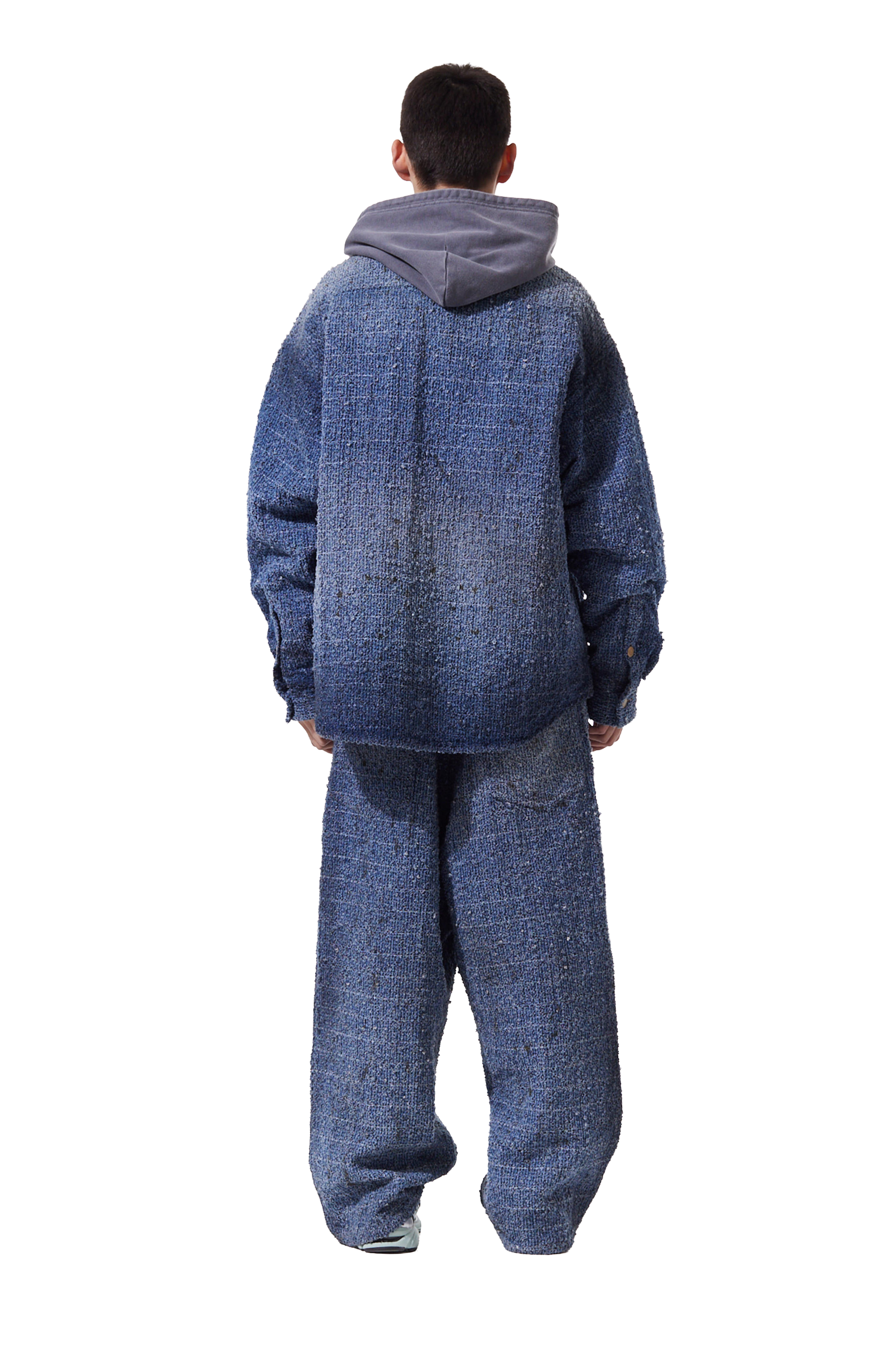This oversized denim jacket employs laser distressing and washing techniques to create texture.